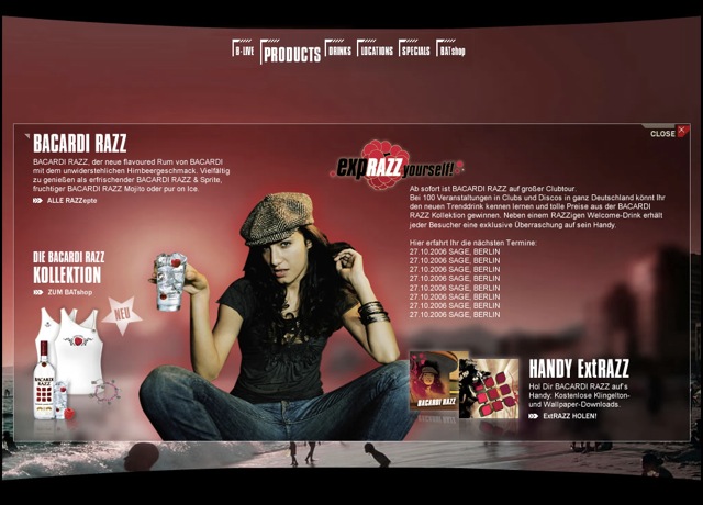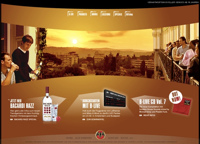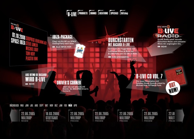 Die Bacardi Website wurde 2006 einem Relaunch unterzogen. Im Fokus stand dabei Bacardis eigene Partyreihe "B-Live". In einem aufwendig gestalteten Bereich der Seite konnte sich der User im Vorfeld über die Partydetails wie Musik, DJs und Location umfangreich informieren. Zudem wurde dem User die Möglichkeit gegeben, für den bevorzugten Happy-Hour-Drink des Abends abzustimmen oder sich mit anderen Bacardi-Fans in der B-Live-Community auszutauschen.