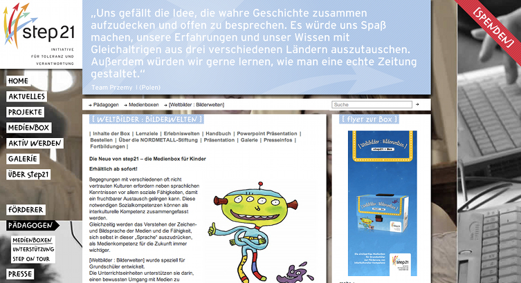 Die gemeinnützige Initiative step21 hat den Anspruch, die Sozial- und Medienkompetenz von Jugendlichen zu stärken. Durch Medienprojekte werden Grundwerte wie Toleranz, Verantwortung und Zivilcourage vermittelt. Step21 kam mit der Anfrage auf die argonautenG2 zu, ihre Website pro bono zu relaunchen. Ziel war es, ein gutes Produkt zu entwickeln, das mit geringen Mitteln umgesetzt wird und zukünftig auch von der Step21-Redaktion selbstständig gepflegt werden kann. Eine weitere Herausforderung bestand darin, mit der Website mehrere, komplett unterschiedliche Zielgruppen anzusprechen - junge Erwachsene, Pädagogen sowie potentielle Förderer. Die Website wurde in Typo 3 umgesetzt und wird von step21 regelmäßig mit neuen Inhalten bespielt.